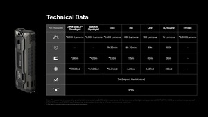 ハイ 1,500ルーメン、ミドル 400ルーメン、ロー 100ルーメン、ウルトラロー 15ルーメン