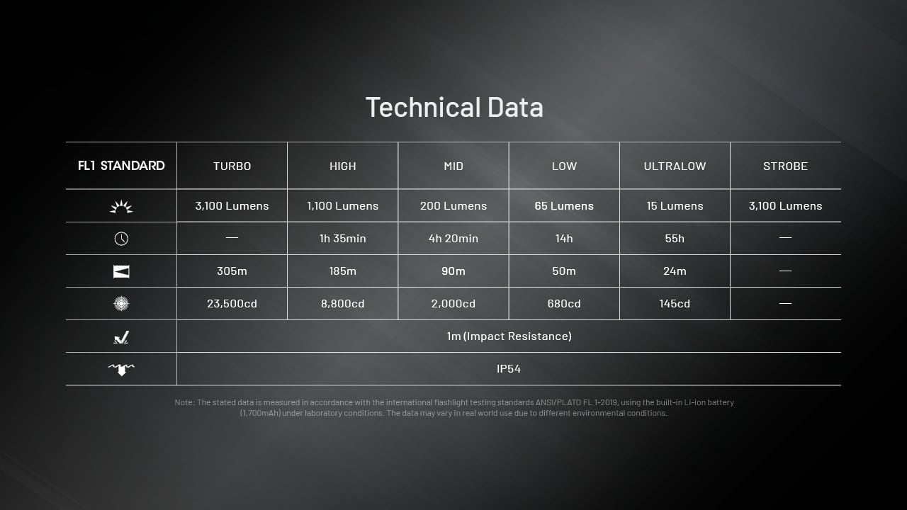 [最大光束、光量] ターボ: 3,100 ルーメン、23,500cd